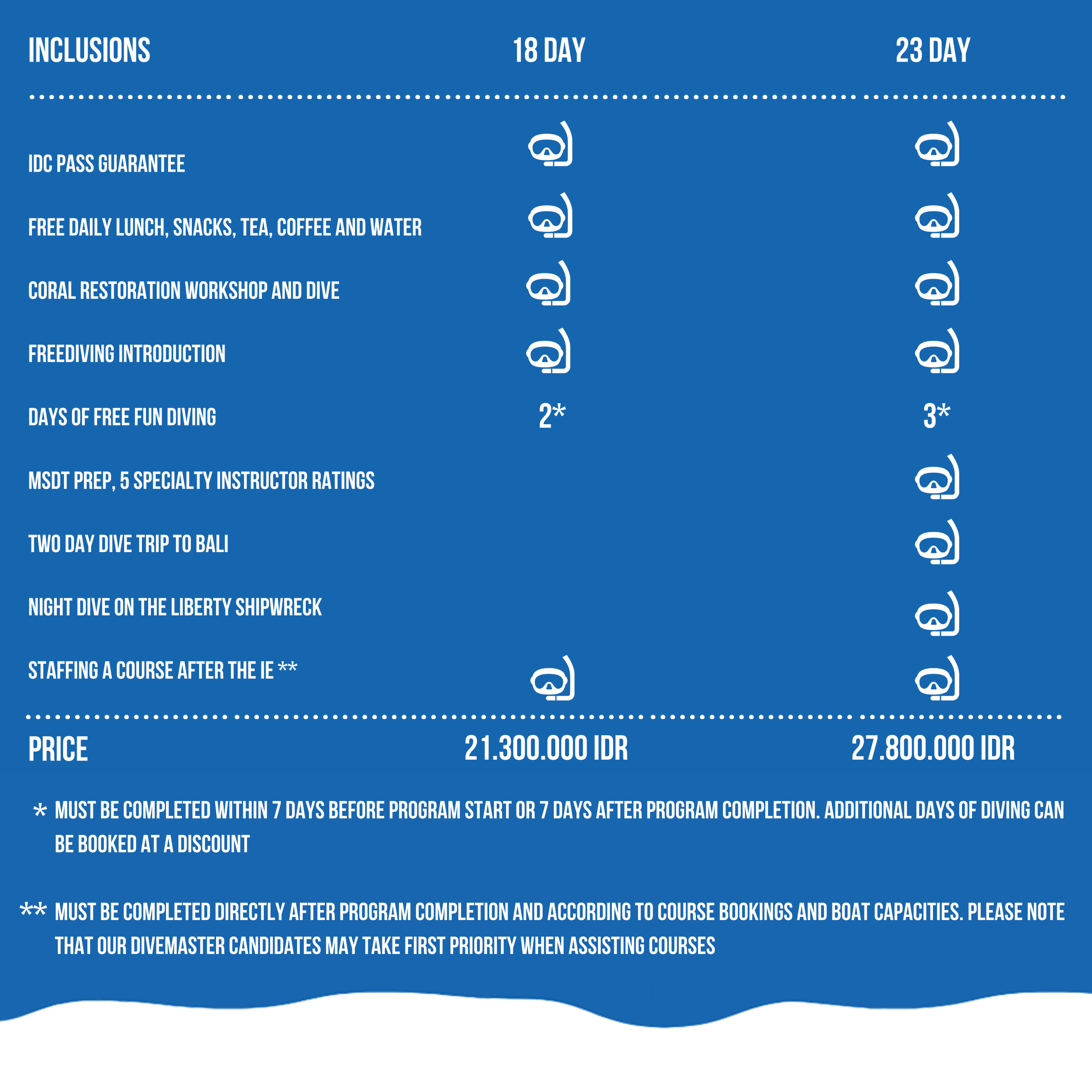Di dalam progam idc ini sudah termasuk 5 MSDT peringkat specialty instructor akhir yang di perlukan untuk menerapkan sertifikasi sebagi seorang Master Scuba Dive Trainer (MSDT) dan membuat anda berharga di dalam dive industry, kami juga memberikan beberapa barang lainnya, dan juga perjalanan gratis ke bali dan menginap semalam di tulamben dan menyelam di reruntuhan kapal liberty tulamben gratis kamar selama course dan juga Dive Against Debris specialty instructor – padi fee sudah termasuk.